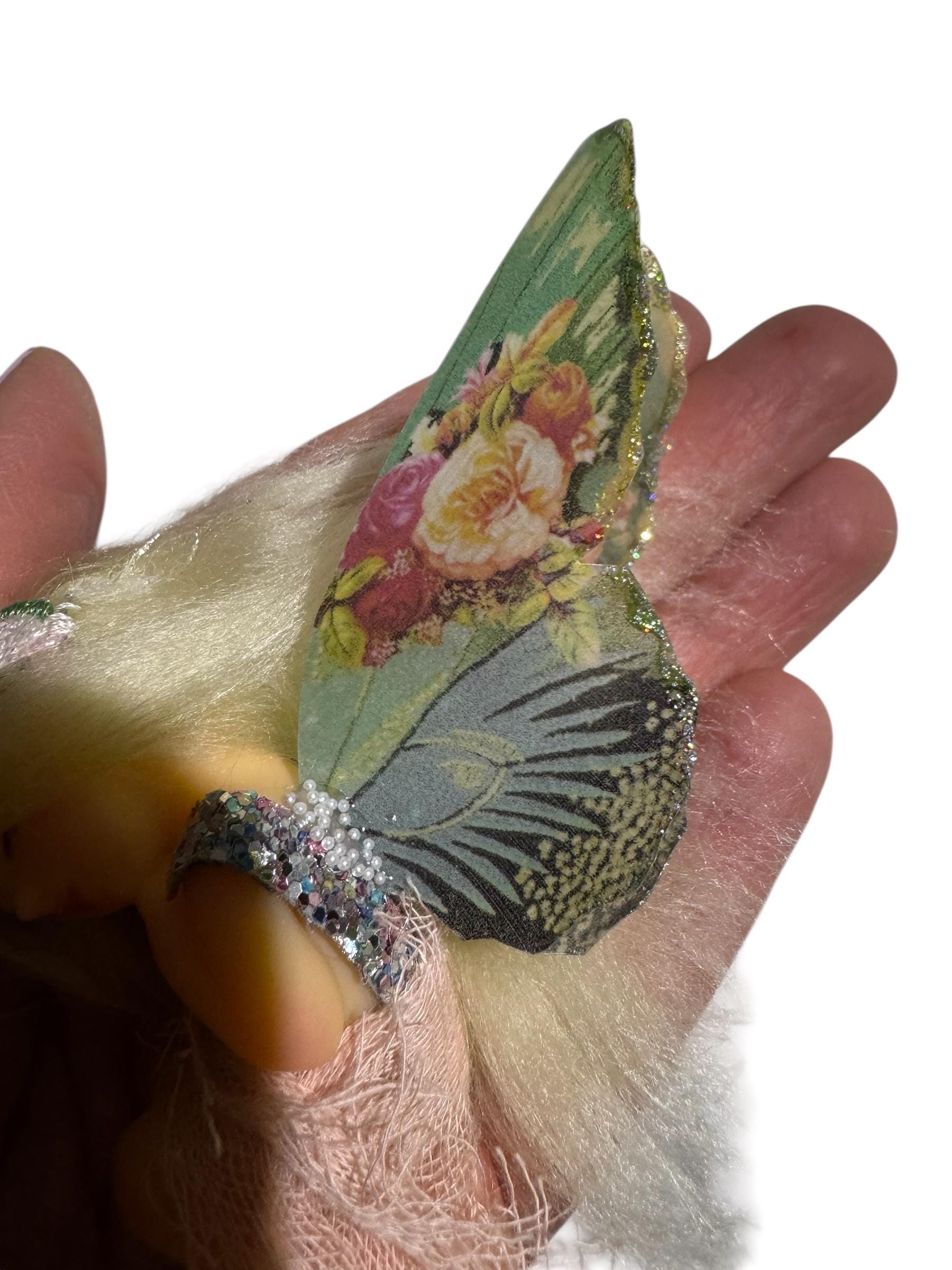 Misty has a sparkly top with a matching headband. Her tutu is made from a gauze material. She had long silky blonde yarn hair and wings with a printed floral print with holographic glitter embedded in resin.